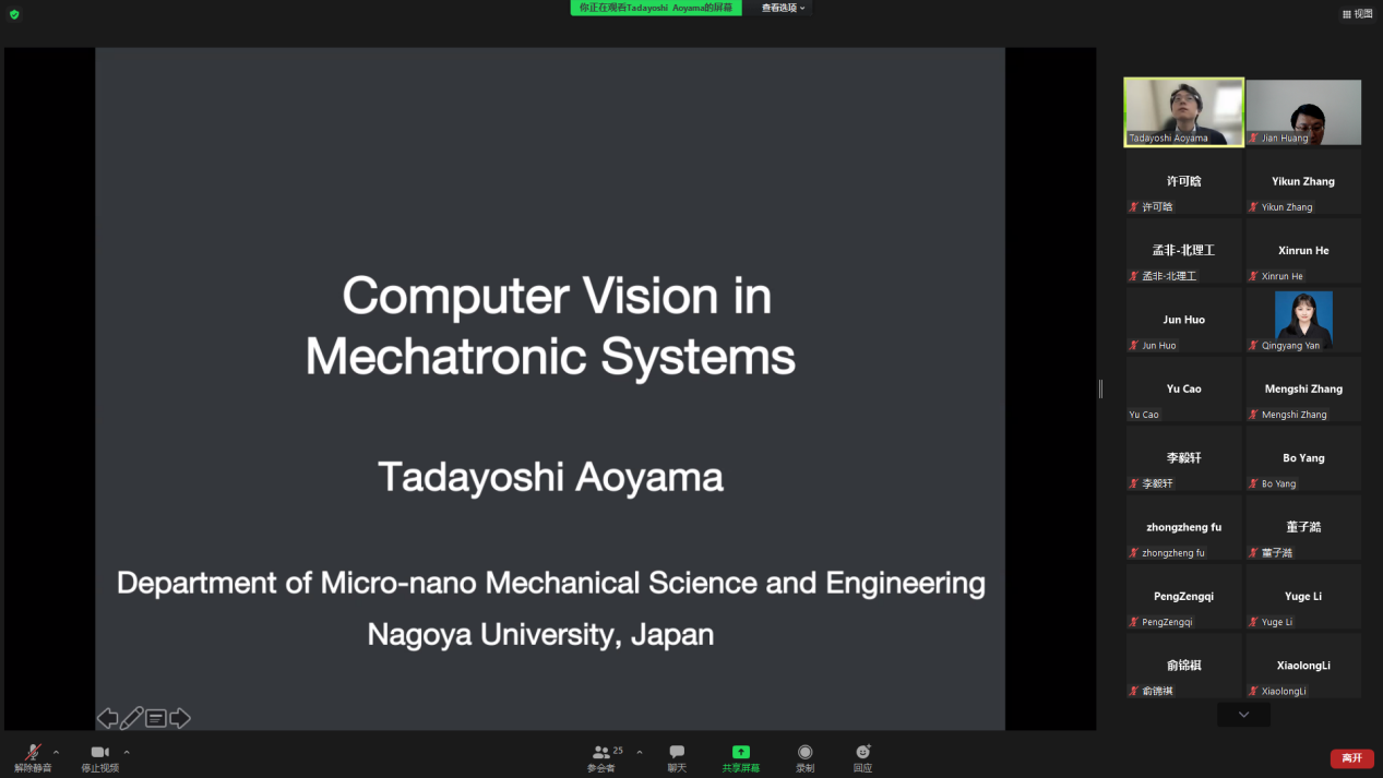 本次讲座由名古屋大学的青山忠义(Tadayoshi Aoyama)副教授进行专题报告。青山忠义副教授作了题为“Computer Vision in Mechatronic Systems”(机械系统中的计算机视觉)的报告。他简单地介绍了自己在机器人控制、高速视觉感知以及人机交互等研究领域相关工作,随后详细介绍了对运动微生物的高速视觉捕捉系统的研究。青山忠义副教授首先针对运动对象的焦点深度、目标位置检测等问题设计了一种基于高速视觉和振动台的高速视觉捕捉系统,可以实时获取运动目标的清晰图像,并通过实验对提出方法进行了验证。随后,他介绍了关于显微镜下目标物实时跟踪系统的研究,该研究实现了多目标物跟踪的同时,将显微观测视野扩展。此后,他讲解了水滴显微跟踪系统,通过对多个液滴的运动跟踪实验,验证了所提出跟踪算法的有效性。在讲座的最后,青山忠义副教授展示了用于显微注射的视野扩张显微系统,以及实时3D图像显示系统。
