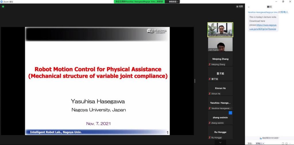第六次讲座由名古屋大学的长谷川泰久(Yasuhisa Hasegawa)教授进行专题报告。长谷川教授作了题为“Robot Motion Control for Physical Assistance-Mechanical Structure of Variable Joint Compliance”(用于身体辅助的机器人运动控制-可变关节柔度的机械结构)的报告。他首先介绍了可穿戴机器人的关键技术,包括机械结构、驱动、接口、舒适性与亲和性以及安全性等,而后,着重介绍了可变刚度的柔性驱动关节。长谷川泰久教授从刚度的定义开始,深入浅出地依次为大家讲解了刚度与柔顺性的关系,自适应柔顺性的实现,以及主动柔性与被动柔性的变刚度驱动器。最后,他介绍了可变刚度柔性驱动关节在两种辅助机器人系统中的应用。
