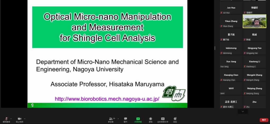 本次讲座由名古屋大学的丸山央峰(Hisataka Maruyama)教授进行专题报告。丸山央峰教授作了题为Optical Micro-nano Manipulation and Measurement for Single Cell Analysis(用于单细胞分析的光学微纳操作和测量)的学术报告。他首先简述了微流控芯片和微操作的优点,由此引出了灵巧微操作的多光束操作。之后,丸山教授展示了用于微环境测量的荧光微传感器,并演示了多荧光微工具的制作流程。他还介绍了单病毒感染与受感染细胞的温度和pH测量,并对病毒感染细胞的生理变化进行了分析,同时对使用介电泳(DEP)力富集病毒的方法进行了介绍和评估。最后,他讲解了将单传感器注入细胞内进行细胞内测量的相关知识。