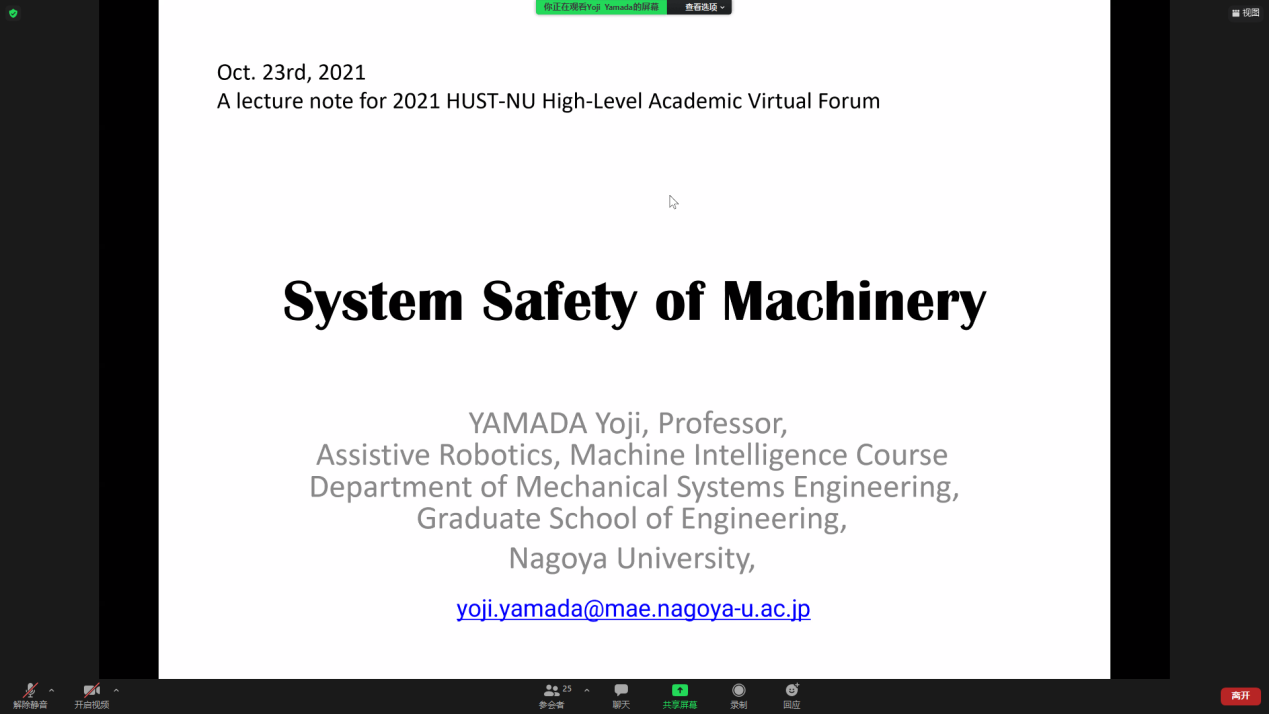 本次讲座由名古屋大学的山田阳滋(Yamada Yoji)教授进行专题报告,报告题为System Safety of Machinery(机械的系统安全)。山田教授首先讲述了人机共存的生产系统案例,由此引出了人机协作中的安全性问题,并对此进行了介绍。其后,他对机械的失效进行建模,并利用该模型对机器人发生故障引发的与人碰撞的场景进行了仿真分析。他还介绍了物品可用的生命周期,并分别对可修复和不可修复物品的生命周期进行了分析,同时使用了马尔可夫(Markov)模型进行可用性评估。最后,他讲解了系统冗余的相关知识。