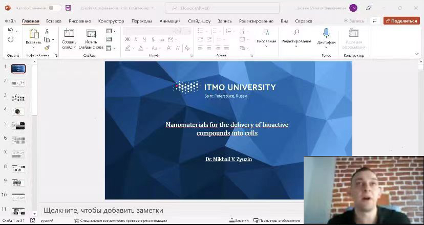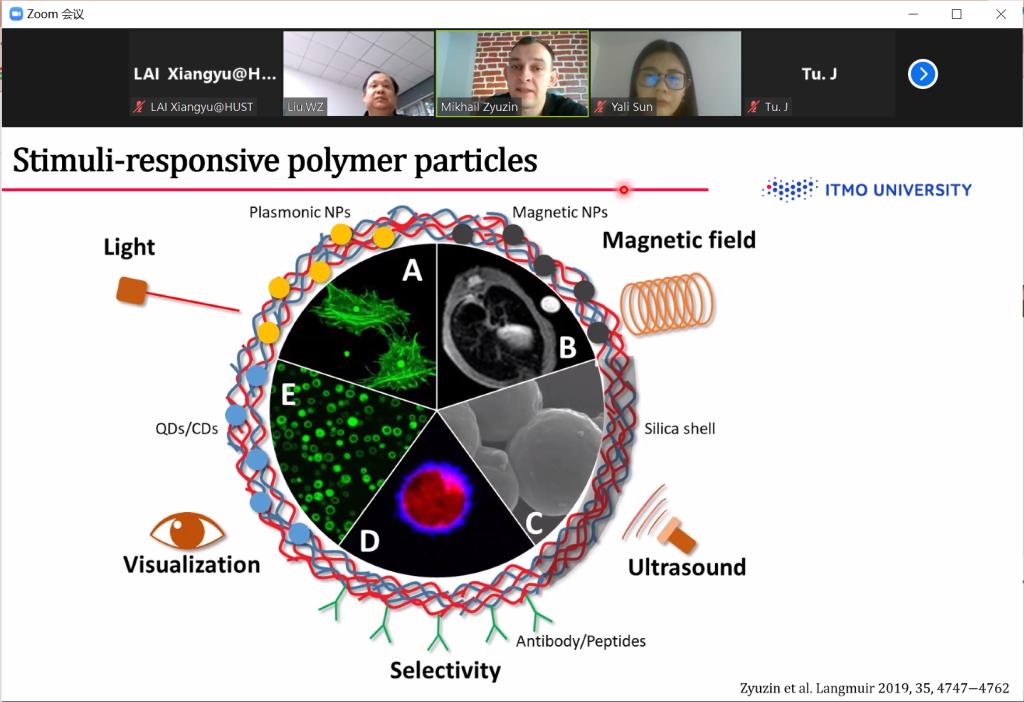 2022年3月17日,beat365唯一官网刘文中教授邀请俄罗斯圣光机大学(ITMO)的Mikhail Zyuzin研究员线上做讲座。Zyuzin博士做了题为"Nanomaterials for the delivery of bioactive compounds into cells"(用于将生物活性化合物输送到细胞中的纳米材料)的报告。此后,双方就专题报告和合作进展交换意见。本次讲座由刘文中教授主持,刘文中教授团队成员、Zyuzin研究员团队成员参会。
