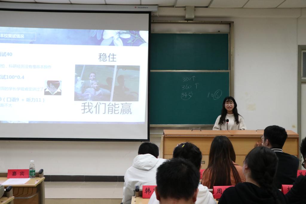 在考研交流会中,李思畅详细介绍了自己考研考研过程中,初试复习、复试笔试、复试面试、联系导师的全过程,她认为“考研不是一条平坦的大道,但只要用心努力过,付出过,不论结果如何,都是值得。”麦英伦提出了自己对整个考研过程中生活细节的建议。他详细讲述了备考研友、备考地点的选择,强调在备考时不要携带手机,要关注网络上的考研信息,养成良好的作息时间和习惯等等;杨宇同学作为专业课满分选手,分享了考研经验;罗小丽同学则重点讲述了自己考研路上所犯的一些错误,希望同学们引以为戒,少走弯路。