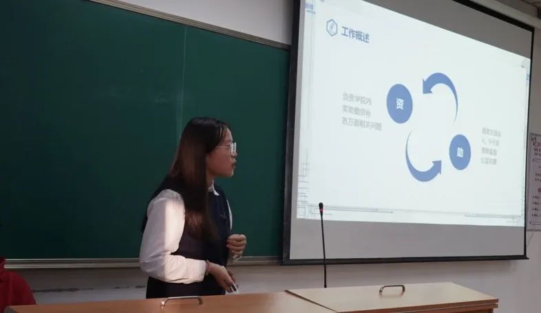 而后,由资助助理委员会主任黄嘉馨介绍工作,展望新一年的工作。她介绍了组织的主要构成,并对部门的各项工作做了概述。她希望成员们能够认真思考自己工作的意义,做好工作总结,将想法落实到行动,从而为进一步的工作做好铺垫。