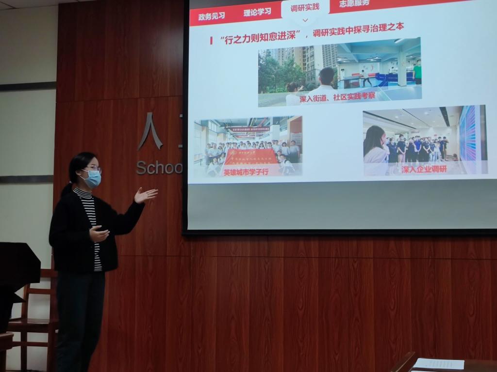 接下来,邝梅红分享了自己在政务见习时的所见、所想、所感。她从政务见习、理论学习、调研实践、志愿服务四个方面分别展开——“致广大而尽精微”,在政务见习中服务民生;“读书以养浩然之气”,在理论学习中夯实思想之基;“行之力则知愈进深”,在调研实践中探寻治理之本;“积小善为大善”,在志愿服务中贡献青春力量。她勉励青马学员作为新时代青年,应当学习雷锋精神,做好一颗合格的螺丝钉,引导同学们向内思考、向下生长,将理论与实践相结合。