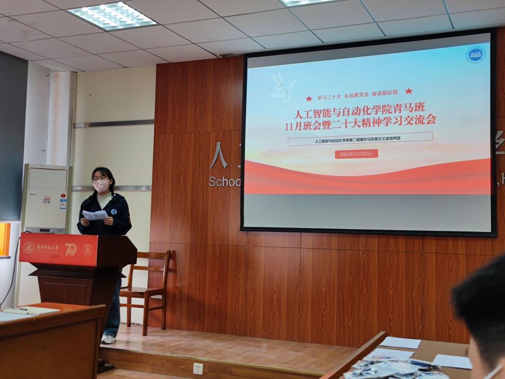 11月27日下午,beat365唯一官网第二期“青年马克思主义者培养班”(以下简称“青马班”)在南一楼中311会议室开展了11月班会暨党的二十大精神学习交流会活动。此次理论学习特邀请学校研究生红色理论学讲团讲师李让进行理论宣讲、校青马学员代表邝梅红进行政务见习感想分享,全体青马班学员参与了学习,学院团委副书记贺聪炜参加班会。