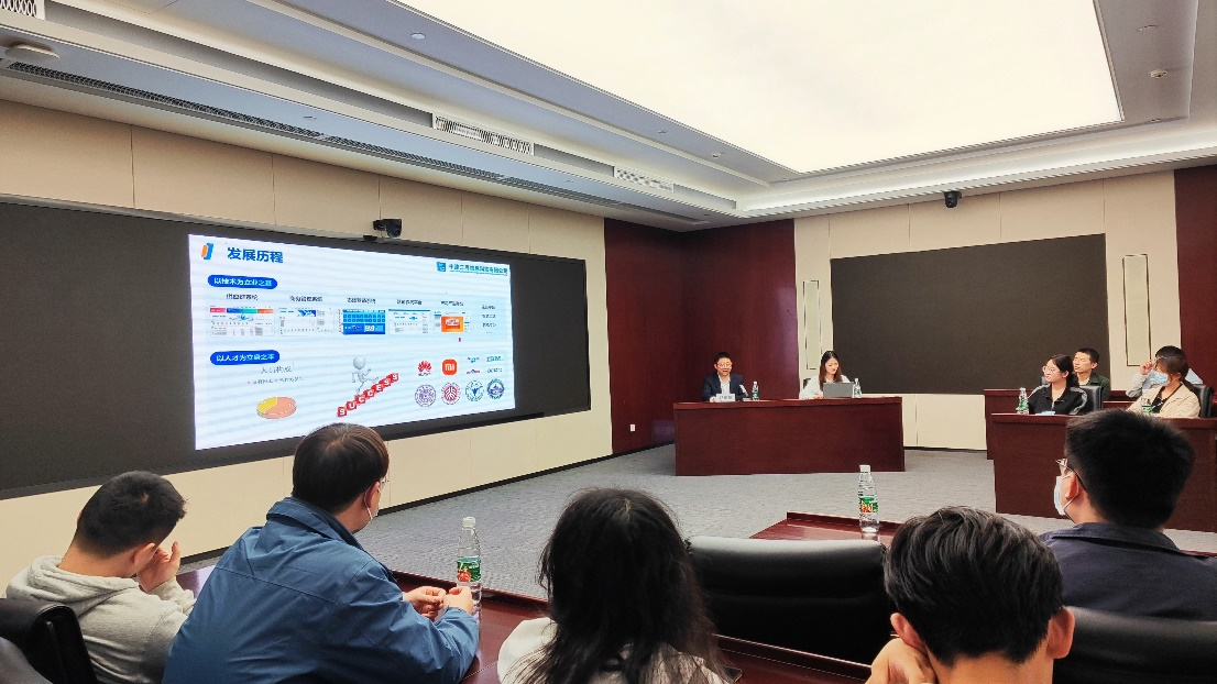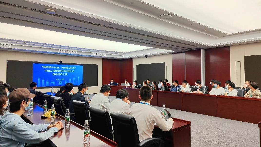 参观结束后,师生一行来到会议室与已入职的校友们进行交流座谈。会上,与会人员共同观看了企业宣传片,了解了企业文化以及发展历程。中建三局信息技术研究院副院长赵祺超向师生们介绍了中建三局信息科技有限公司的成立背景、发展规划、公司主业和招聘需求。
