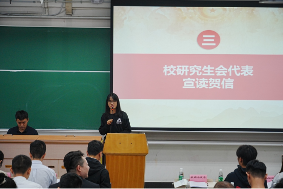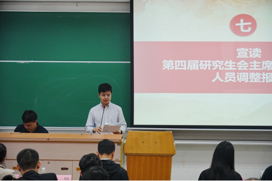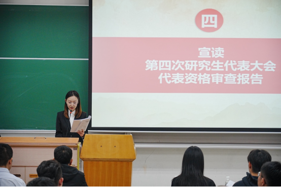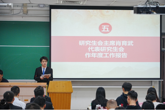 随后校研究生会代表刘慧宣读了贺信;院研究生会主席杨懿宣读《beat365唯一官网第四次研究生代表大会代表资格审查报告》;院研究生会主席肖育武作《beat365唯一官网研究生会2022-2023年度工作报告》,经大会表决一致通过;学院德育助理田铭作《beat365唯一官网第四次研究生代表大会提案工作报告》。