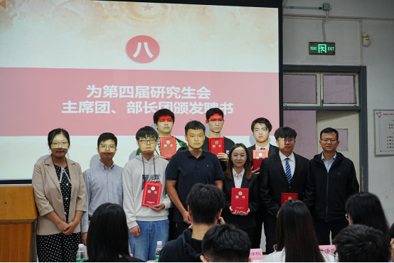在辅汪昭老师宣读《beat365唯一官网第四届研究生会主席团、部长团人员调整报告》后,第四届研究生会主席团、部长团正式卸任,由曹攀辉书记、研究生辅导员汪昭和程杨为主席团、部长团颁发聘书。