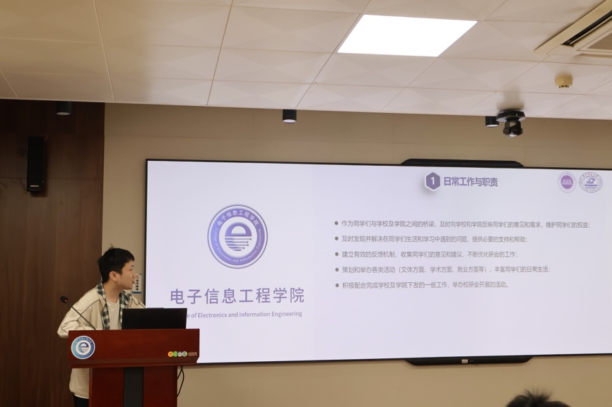 周海翔着重介绍了中南民族大学电子信息工程学院研究生会以工作手册为指南,以企业微信为载体,在研会工作规范化和数字化上的一系列探索实践。