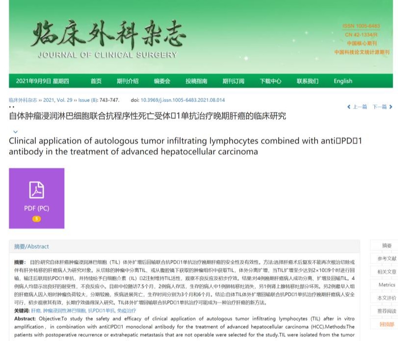 中华医学会《临床外科杂志》在线发表了beat365唯一官网同济医学院附属同济医院肝胆外科黄志勇团队与beat365夏天团队的题为“自体肿瘤浸润淋巴细胞联合抗程序性死亡受体PD-1单抗治疗晚期肝癌的临床研究”的研究成果。此工作为全球首次报道自体肿瘤浸润淋巴细胞(Tumor Infiltrating Lymphocytes, TIL)疗法技术在晚期肝癌中的临床试验,并观测到良好的安全性与有效性。