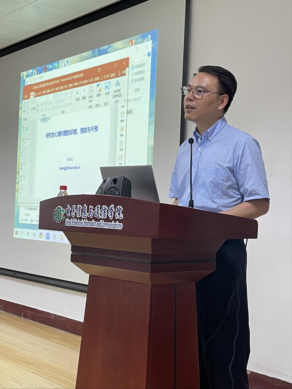 章劲元作了题为“研究生心理问题的识别、预防与干预”的讲座。当前,研究生教育中心理危机问题不断出现,保障研究生的心理健康是研究生导师培养工作中的重要一环。章主任从六个研究生心理问题典型案例分析切入,展示了研究生心理问题的类型与形式,再针对性梳理了心理问题的识别与对策,如何有效帮扶各类存在心理困扰的研究生。之后章主任还谈到了研究生导师自身的压力管理现状,阐述了如何预防“师源性”危机,提出多条操作性强的建议。最后他以《高等学校学生心理健康教育指导纲要》中的一段话与大家共勉:坚持育心与育德相统一,加强人文关怀和心理疏导,引导学生正确认识义和利、群和己、成和败、得和失、培育学生自尊自信、理性平和、积极向上的健康心态,促进学生心理健康与思想道德素质、科学文化素质协调发展。