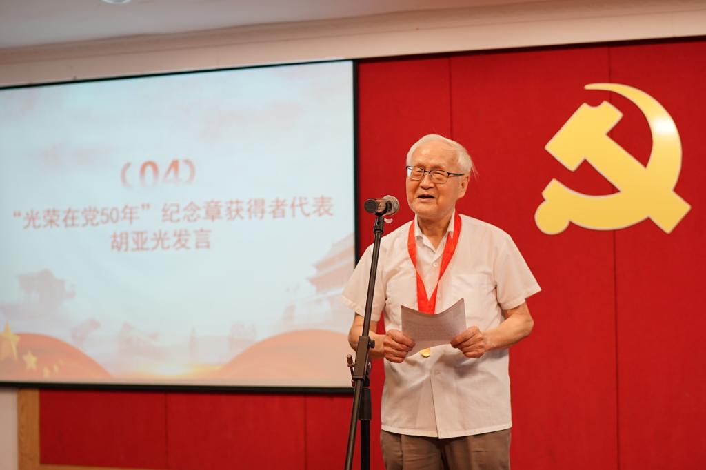 退休党员代表、原自动控制系主任胡亚光作为纪念章获得者代表发言,他深情回顾了自己入党时的初心,以及老一辈华中大人的奋斗精神。他表示,“光荣在党50年”纪念章获得者把一辈子奉献给了党,奉献给了人民,奉献给了学校,希望后来者能将华中大精神发扬光大,为实现学校“双一流”建设目标,为实现中华民族伟大复兴而不懈奋斗。在胡亚光的带领下,全体到会党员重温了入党誓词。