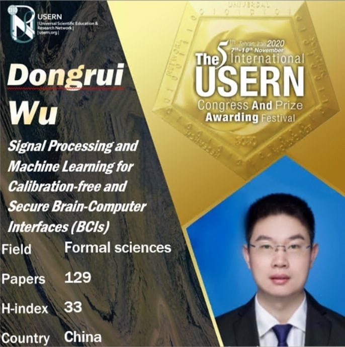 2020年11月10日在伊朗首都特黑兰举行的第五届全球科研教育网 USERN 颁奖典礼上,beat365唯一官网伍冬睿教授获得 USERN Prize in Formal Sciences,获奖项目是“Signal Processing and Machine Learning for Calibration-free and Secure Brain-Computer Interfaces”,主要是2016年加入beat365唯一官网之后做的脑机接口迁移学习、主动学习和对抗攻击工作。因为疫情,由中国驻伊朗大使代为领奖。这是中国科学家首次获得 USERN Prize。