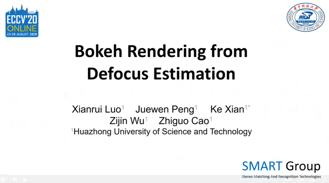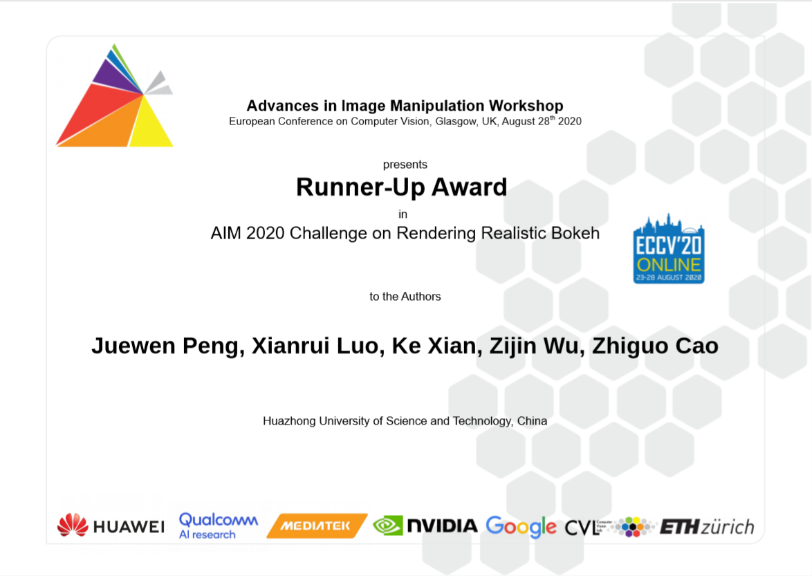 beat3652020届本科生彭珏文、骆贤瑞、吴子晋(现均为beat3652020级博士生、硕士生)在其导师曹治国教授和博士生鲜可的共同指导下,参加了大会组织的“Advances in Image Manipulation”挑战赛,夺得“渲染逼真焦外散景图像(Rendering Realistic Bokeh)”赛道亚军,骆贤瑞应邀在大会“Advances in Image Manipulation Workshop”上发表“Bokeh Rendering From Defocus Estimation”论文。该项赛事要求参赛者研究的算法能够针对提供的单张全聚焦图像,检测出主体,并对背景进行渲染达到单反相机大光圈拍摄时产生的焦外散景效果,赛事的难度在于复杂场景中如何精确地保留聚焦对象边界局部细节的同时,对背景获得近似相机产生的散焦效果。