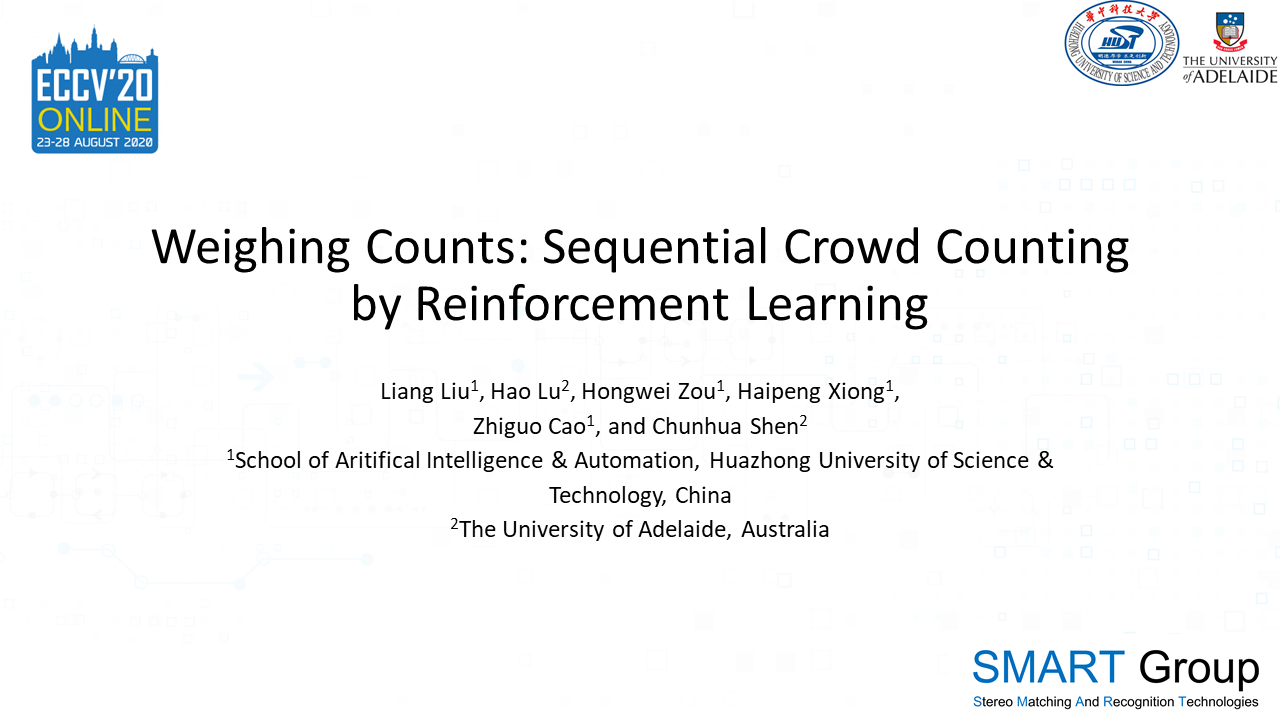博士研究生刘良在导师曹治国教授指导下,与澳大利亚阿德莱德大学的沈春华教授、陆昊博士后合作,发表了论文“Weighing Counts: Sequential Crowd Counting by Reinforcement Learning”。该论文的研究工作得到国家自然科学基金的资助,将传统的一步预测的人群计数范式,转化为多步的时序决策问题,并采用深度强化学习方式实现。该方法受天平称重的启发,在预测过程中,每一步选择不同的数值增加动作,直到网络判断累计的数值和输入图像中的人群数目相等为止。通过这样的范式变换,复杂的一步预测问题被拆解为多个较为简单的子问题,从而更加易于预测。文章提出的方法不仅在多个人群计数公共数据集上表现优异,并且拥有较好的泛化性能。同时文章还验证了提出的方法可以作为现有方法的插件进行工作。
