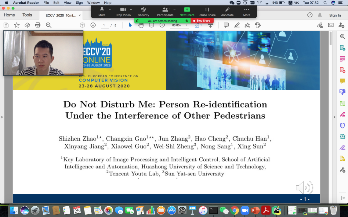 硕士研究生赵世震在高常鑫副教授和桑农教授的指导下,与中山大学郑伟诗教授和腾讯优图实验室孙星研究员合作,在大会发表了“ Do Not Disturb Me: Person Re-identification Under the Interference of Other Pedestrians”论文。该论文的研究工作在科技部重点研发项目和国家自然科学基金面上项目的资助下,针对行人重识别问题提出了一种可以抑制行人干扰问题的深层神经网络。传统的行人重识别假设裁剪的图像只包含单人。然而,在拥挤的场景中,现成的检测器可能会生成多人的边界框,并且其中背景行人占很大比例,或者存在人体遮挡。从这些带有行人干扰的图像中提取的特征可能包含干扰信息,这将导致错误的检索结果。为了解决这一问题,该论文方法首先利用查询图片引导的注意力模块来增强图片中目标的特征。此外,我们提出了反向注意模块和多人分离损失函数促进了注意力模块来抑制其他行人的干扰。该方法在两个行人干扰数据集上进行了评估,结果表明,该方法与现有的Re-ID方法相比具有更好的性能。