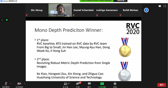 本次大会进行的“鲁棒视觉挑战赛(Robust Vision Challenge 2020)”, 是继2018年CVPR “鲁棒视觉挑战赛”后,全球第二次组织此专题竞赛。本次竞赛结果于8月28日揭晓,博士研究生鲜可与硕士研究生邹红威、熊昕组队,在导师曹治国教授指导下,获得“单目深度预测”赛道亚军,鲜可应邀在大会“Robust Vision Challenge 2020 Workshop”上报告参赛方法。该项赛事要求参赛者提供的单一模型能够在四个不同场景的数据库上针对输入的单张图像预测出图像中每个像素的绝对深度,以预测精度等多项指标衡量性能。在多个数据集混合训练过程中,不同数据集的深度感知范围差异较大,为了提升模型的特征表达能力,该项工作在编码器末段引入了一个新的特征嵌入层以及在解码器中引入局部平面引导层。在有效的提交方案中,该模型在四个数据集上的综合表现排名第二。2018年鲜可、硕士生李睿博(现在南洋理工大学攻读博士学位)在导师曹治国教授指导下也曾夺得该项赛事“单目深度预测”赛道第二名。
