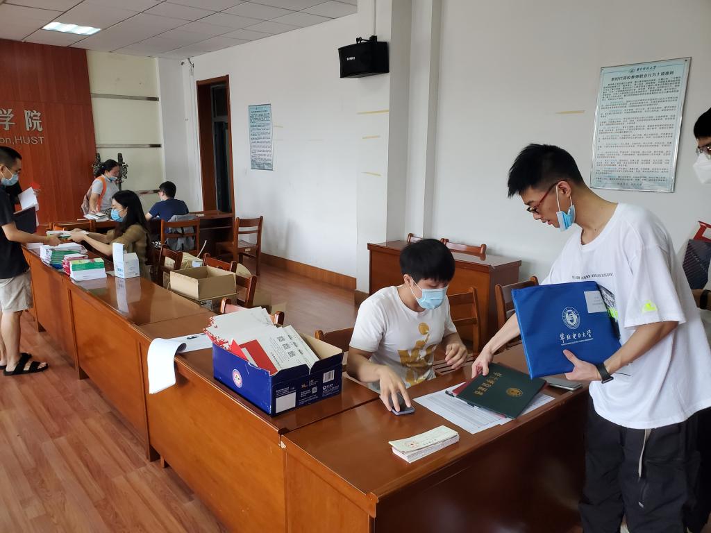 在南一楼,研究生教务老师、辅导员和德育助理们早已做好前期准备工作,等待着“萌新们”的到来。核验身份信息,上交证书复印件,领取学生手册、研究生登记表、校徽和体温计等物资,确定体检时间,新生同学和迎新工作人员配合默契,在遵守学校防疫工作要求的前提下,有条不紊地完成了各项线下报到工作。