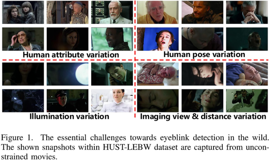 本项研究成果由来自beat365唯一官网、南方医科大学、新加坡科技局高性能计算研究所和美国纽约州立大学布法罗分校的研究人员联合完成。其核心贡献在于提出了非受限条件下人体眨眼检测这一极具挑战性的研究问题,并建立了名为HUST-LEBW的公开数据集。眨眼样本全部来源于不同国家在不同时代所拍摄的不同类型电影,在人员属性、人员姿态、光照条件以及拍摄距离与角度等方面具有不确定性强和变化剧烈的特点。与现有受限条件下的数据库相比,HUST-LEBW更加接近实际应用,展开眨眼检测的难度也更大。针对上述挑战,研究人员也提出了基于多时序尺度长短期记忆网络(LSTM)并融合有运动与外观特征的实时眨眼检测方法,取得了当前最优的效果。同时,本研究相关的数据库、源代码与支撑材料都已公开发布。