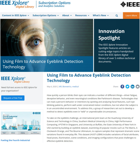 beat365肖阳副教授、曹治国教授所指导的硕士研究生胡桂雷同学一作发表在IEEE Transactions on Information Forensics and Security上关于非受限条件下人体眨眼检测的研究论文“Towards Real-time Eyeblink Detection in The Wild: Dataset, Theory and Practices”入选电气和电子工程师协会IEEE Innovation Spotlight亮点论文(https://innovate.ieee.org/innovation-spotlight/eyeblink-detection-biometrics)。IEEE Innovation Spotlight亮点论文代表了IEEE各学科方向上的前沿研究问题,每年全球仅有24篇论文入选。