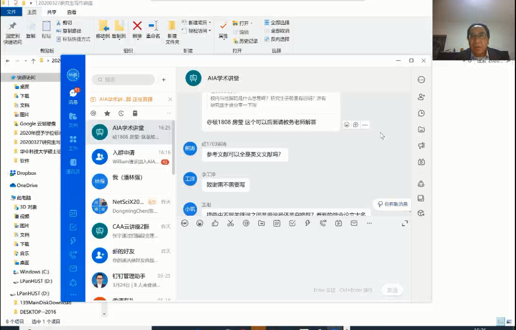 观看讲座直播的同学在认真听讲的同时,也不忘积极互动。对于不少同学提出的与学位论文写作、评审相关的共性问题,潘林强也一一作出了具体解答。近两个小时的讲座直播结束后,参与的同学表示收获颇丰。16级博士吴肖龙觉得讲座对学位论文的写作非常有帮助,从Latex公式到word封面、正文排版都讲解的非常细致,同时对于盲审要求的讲解也非常细致,有助于提升学位论文的逻辑、句式及各章节撰写技巧,令自己受益匪浅;17级学术型硕士唐淑贤非常感谢学院在疫情期间对毕业研究生的关心和指导,表示作为毕业研究生应该发挥主观能动性,充分利用网络资源提高主动解决问题的能力;18级的工程硕士房莹特别提到,潘老师在多个关键细节位置给予了详细的说明,,耐心解答了大家在修改论文和准备送审过程中的诸多问题,这份关心和帮助来的“非常及时”。