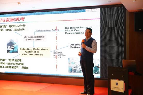 新加坡国立大学葛树志教授作了题为“机器人与人工智能技术的融合——通往智能社会之路”的报告。报告中,葛教授首先介绍人工智能的概念、发展过程与未来潜力,阐述机器人的发展历史及不同阶段的应用。然后,讨论人工智能技术给机器人带来的助力及融合人工智能与机器人技术后对社会带来的新影响,并介绍其团队在这方面的相关工作,特别是社会机器人方面的工作。最后,葛教授对人工智能及机器人的前景进行展望,并与大家分享了几点思考。葛教授用诙谐幽默的语言将机器人与人工智能变得通俗易懂,让会场氛围十分活跃。