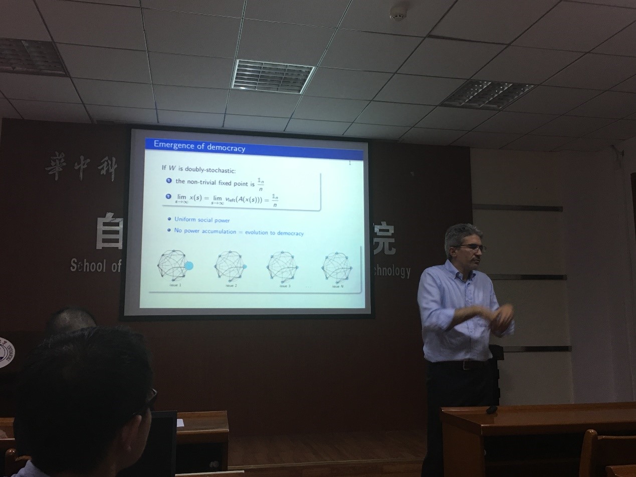 7月27日下午,加州大学圣塔芭芭拉分校Francesco Bullo教授应邀来beat365进行学术交流,并做了题为“On the Dynamics of Opinions and Influence Systems ”的学术报告。报告会由张海涛教授主持,袁烨教授,卢森堡大学Jorge教授等30多位师生参加了报告会。
