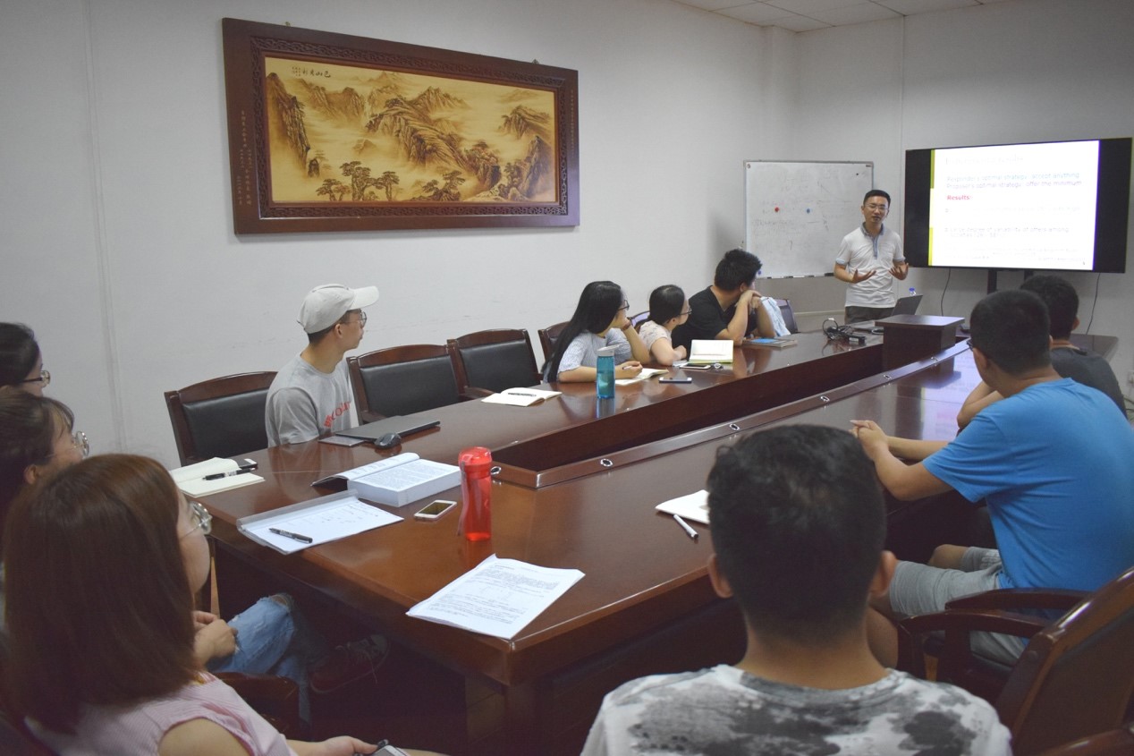2018年7月6日上午9点,电子科技大学计算机科学与工程学院荣智海教授应苏厚胜教授邀请来自动化学院做了迭代博弈理论相关研究的学术报告,报告的题目是“博弈理论的零行列式策略研究进展”。报告会由苏厚胜教授主持,学院从事复杂网络和网络博弈相关研究的老师和学生共十余人参加了报告会。