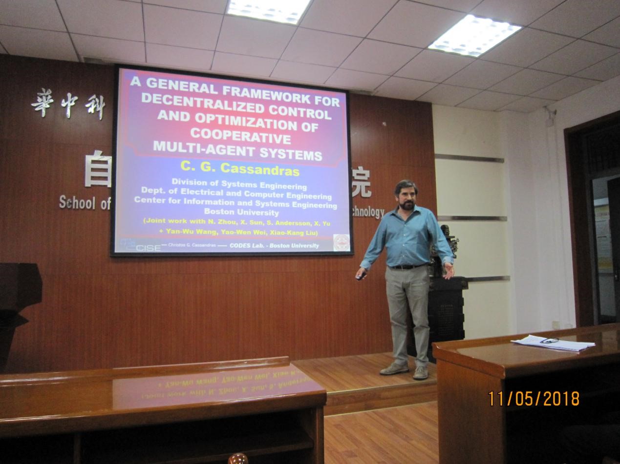 5月11日上午,波士顿大学( Boston University)杰出教授、IEEE和IFAC院士Christos G. Cassandras博士应关治洪教授邀请来beat365进行学术交流,并作了题为“A General Framework for Decentralized Control and Optimization of Cooperative Multi-agent Systems”的学术报告。报告会由关治洪教授主持,我校教师王燕舞、刘智伟、池明、胡滨等30多位师生参加了报告会。