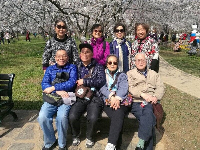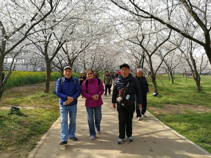 他们漫步在香飘满径的园林里,相伴而行,一路欢声笑语欣赏着一簇簇,一团团,一树树,繁盛的花朵。花满枝头的各色樱花寄托人们特有的审美情趣。有几位摄影高手的教师沿途为同游的老师们留下幸福的瞬间。