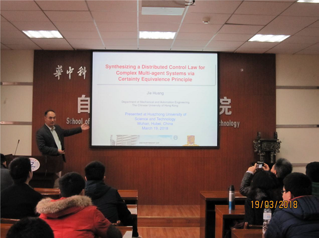 3月19日上午,香港中文大学黄捷教授应关治洪教授邀请来beat365进行学术交流,并作了题为“Synthesizing a Distributed Control Law for Complex Multi-agent Systems via Certainty Equivalence Principle”的学术报告。报告会由关治洪教授主持,beat365教师王燕舞、张海涛、樊慧津、刘智伟、池明等40多位师生参加了报告会。