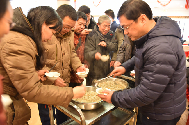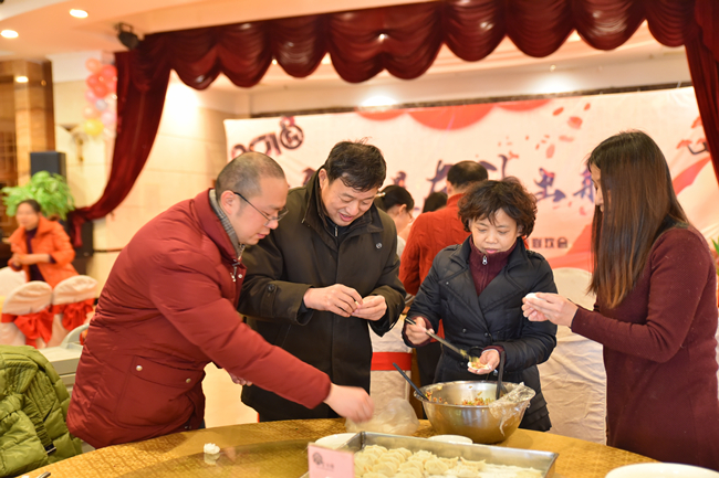 中午,老师们早早来到百景园三楼大厅,一起包饺子欢度佳节,一双双巧手捏出一个又一个饺子,大家一边干活一边唠家常,不一会儿盘子里就放满了饺子,饱满圆润的饺子中包着的是满满的欢乐,饺子煮好后一出锅便被一抢而空。随后党委书记张耀宣读了学院2017年表彰决定,对在教学科研、人才培养、行政管理、国际交流合作、公益活动等方面取得突出成绩的教职工予以表彰。