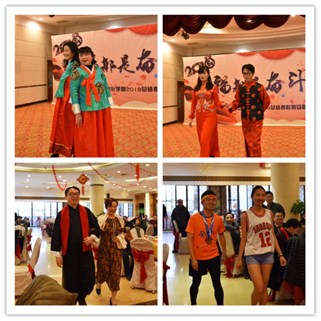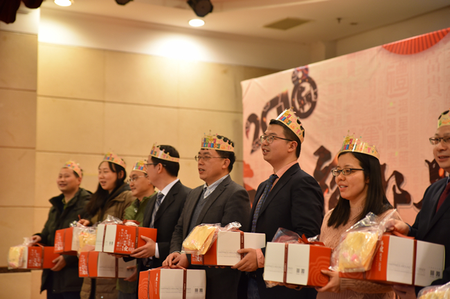 表彰结束后老师们用丰富多彩、别出心裁的节目辞旧迎新:智能系联唱《说唱脸谱》将传统的戏曲与歌曲相结合,情深意远,大气磅礴;行政各科室穿上旗袍、西装、汉服为大家带来《风采新年》时装秀;测量系与实验中心齐声朗诵《起航看中国》,带领大家回顾祖国近年来的发展;飞导系合唱《我爱你中国》,洪亮的歌声振奋人心;系统系合唱《相亲相爱一家人》,表达了老师们间温馨有爱的氛围;学生工作组带来的话剧表演《学工组那些事》生动展现辅导员的日常生活与工作;自控系带来合唱《红军不怕远征难》带领大家重温长征路,合唱结束后,原创诗歌朗诵《自动化,走在新长征的路上》将联欢会推向高潮;学院领导班子的歌曲串烧《在希望的道路上》,结合学院2017年的大事记改编歌词,歌声铿锵有力,成绩催人奋进,展现了自动化学院积极向上的精神风貌,一个个自导自演的节目让大家欢声笑语不断。学院还为满整十岁的老师举行集体生日,同时为本命年老师送上祝福。