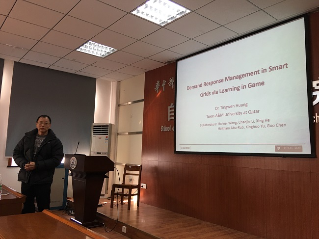2018年1月11日上午10:00,美国德克萨斯A&M大学卡塔尔分校的黄廷文教授应邀来beat365进行学术访问,在南一楼311会议室为beat365师生做了一场题为 “Demand Response Management in Smart Grids via Learning in Game” 的学术报告。关治洪教授、曾志刚教授、王小平教授和刘智伟副教授等30余名师生参加了本次报告会。