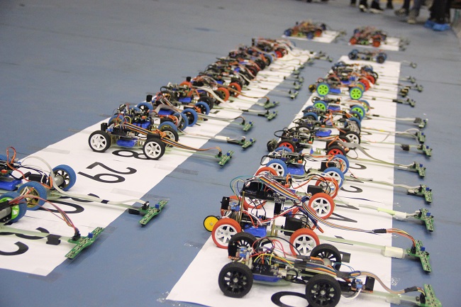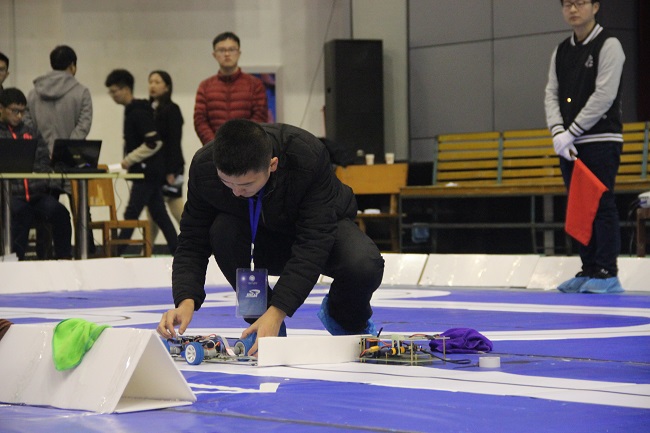 比赛在校团委副书记李嵩给出的发车指令声中开始。决赛采取两车一组同台竞争的形式,小车需要在无人操控的情况下,自行识别路况,完成U型转弯、十字交叉路、S型车道等复杂路况的通行,顺利跑完全程用时最短者胜出,两车竞赛增加了比赛的激烈程度和观赏性。除了我校的参赛队伍,还有来自武汉科技大学,以及中小学的队伍参加这次科技盛会。