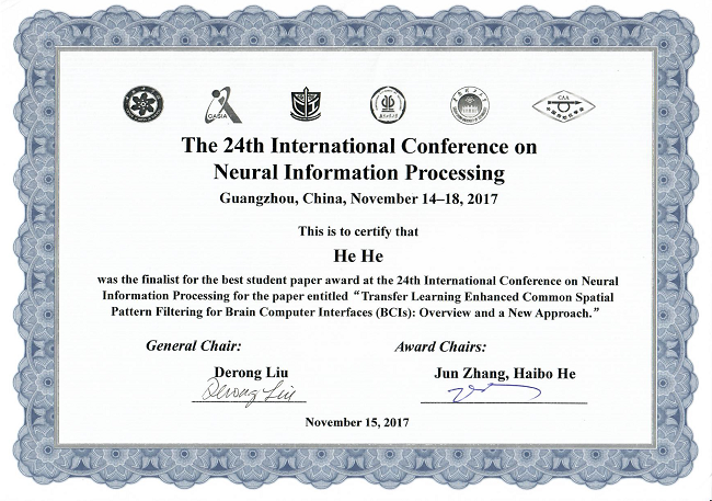 在2017年11月14-18日于广州召开的第24届International Conference on Neural Information Processing (ICONIP)上,伍冬睿教授与其博士生何赫共同完成的论文“Transfer Learning Enhanced Common Spatial Pattern Filtering for Brain Computer Interfaces (BCIs): Overview and a New Approach”入围会议最佳学生论文奖(Best Student Paper Award Finalist)。该文章提出了一种融合迁移学习和共同空间模式滤波器的新方法,能有效提高脑机接口系统在校准数据不足时的准确度。