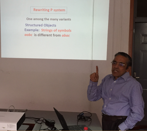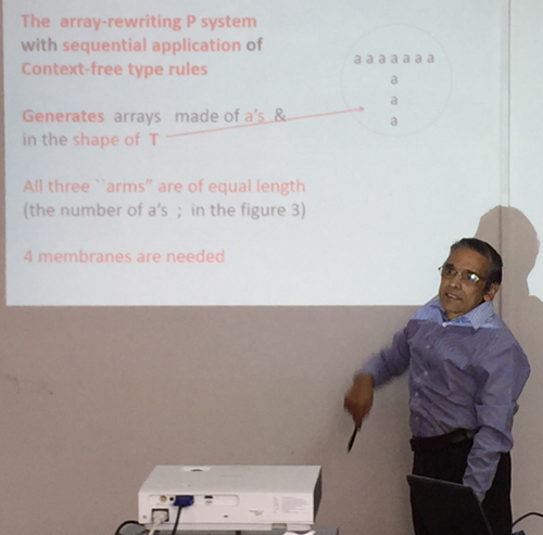 K.G. Subramanian教授介绍了一类新的自然计算模型,膜计算。膜计算是由欧洲科学院院士Gheorghe Păun教授于1998年提出,是当前计算机科学、数学、生物学等多学科交叉的研究热点。本次报告概述了膜计算的发展以及近些年膜计算在理论和应用方面的最新进展,以一个简单的类细胞型膜系统为例介绍膜计算中的一些基本概念和系统运行方式。随后详细介绍了重写膜系统的基本概念,重点介绍重写膜系统在2D图形语言中的一些应用。另外介绍了将剪切等生物操作引入到重写膜系统中,证明重写膜系统可以产生许多图形语言,譬如国际象棋棋盘、字母“T”等。通过本次报告,使本学院师生认识到膜计算在生物系统建模、并行计算等方面都有许多重要的应用。
