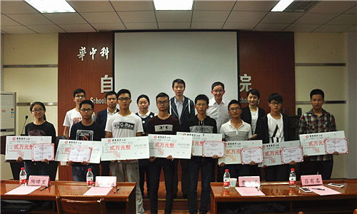 紧接着,陶暐昱女士上台宣读了获奖新生名单,他们分别是:王李、桂亚伟、易明磊、廖尚頔、汤唯唯、夏坤、张俊男、邱天。在热烈的掌声中,吕有名先生和曹治国院长共同为获奖同学颁奖并合影留念。