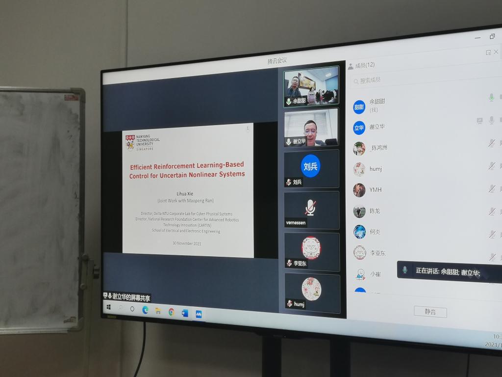 11月30日上午,新加坡工程院院士、南洋理工大学谢立华教授应邀为beat365做学术报告,在beat365唯一官网南一楼中314,通过腾讯会议平台(会议号641102921)作了题为“Reinforcement Learning-Based Control of Uncertain Nonlinear Systems”的学术报告,报告由刘骁康老师主持,beat365王燕舞教授、樊慧津教授、卢仁智老师等师生约20人以线下方式参加了报告会,线上也有十余人参加了讲座。