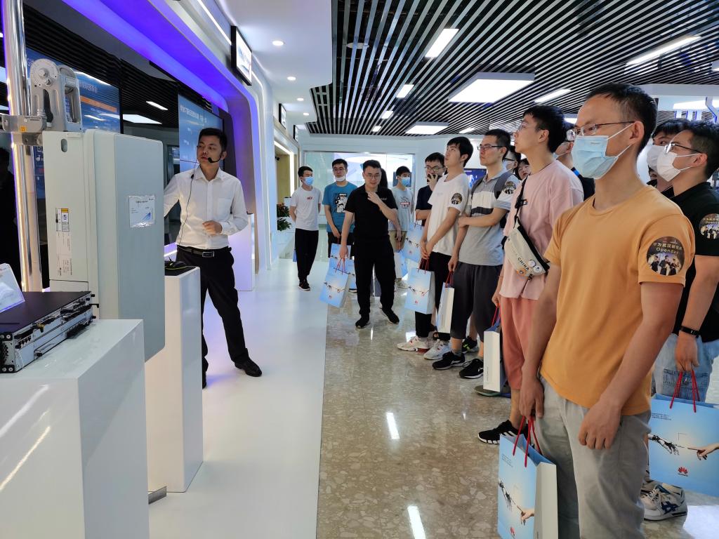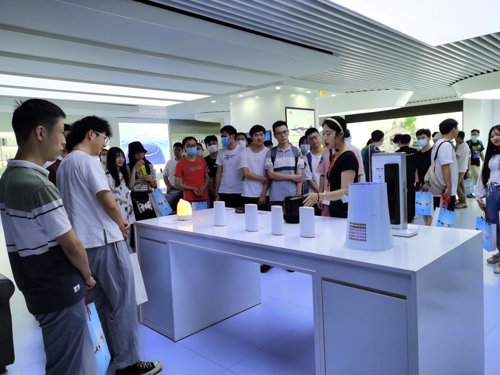 到达园区后,华为招聘经理潘盛智热情地为同学们分发入园参观证,在潘经理的带领下开始了本次参观交流。在OpenLab展厅,师生们参观了华为最新研发的PC电脑、平板、手机以及智能家电等产品。