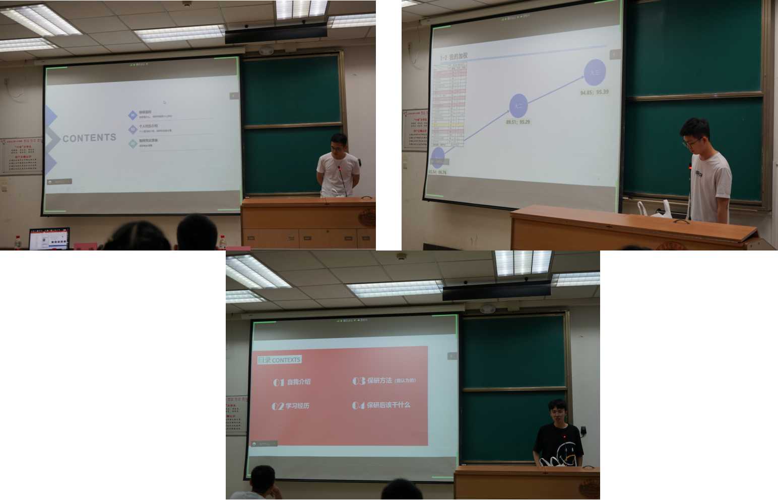 在保研经历交流中,张澳、江明轩、邹洪玉分别介绍了我校保研流程、保研政策、复试考核要求等同学们最为关心的话题,并分享了自己的保研经历与心路历程。其中,邹洪玉以自身经历劝谏同学们要重视平时成绩,提早制定奋斗目标并为之努力,引起了同学们的强烈共鸣。