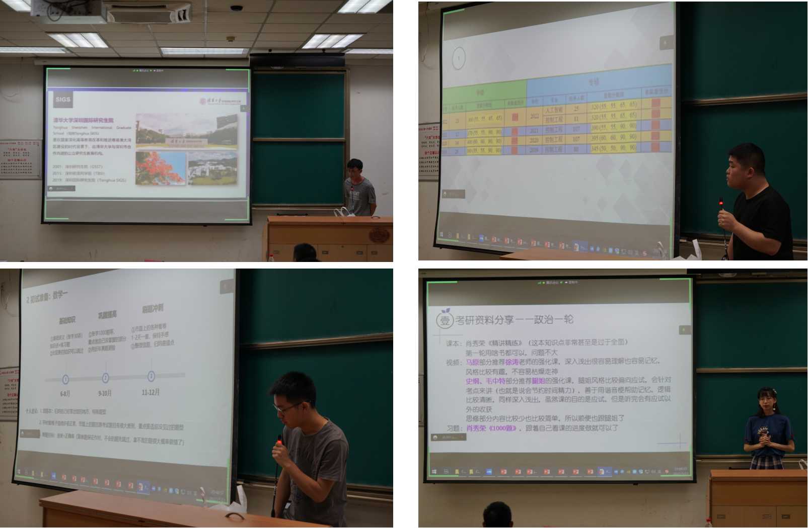 在考研经验分享中,杜秉航重点介绍了其上岸院校的优势长处与报考要求;杨浩、肖聪、常思宇则详细地介绍了他们考研的时间规划、书籍推荐及注意事项,同学们表示收获颇丰。