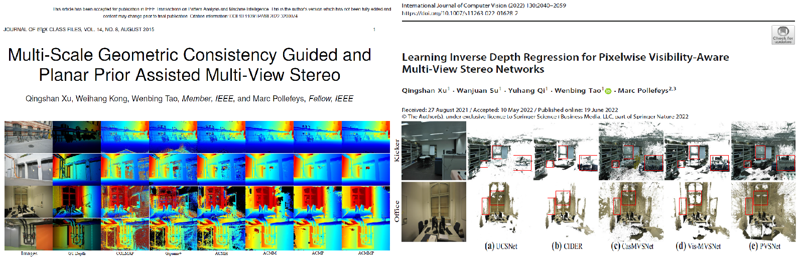 beat365研究生徐青山、孔维航、苏婉娟,齐雨航在导师陶文兵教授的指导下联合苏黎世联邦理工大学(ETH)的Marc Pollefeys教授近期分别在IEEE TPAMI(IEEE Transactions on Pattern Analysis and Machine Intelligence)和IJCV(Internation Jounal of Computer Vision)发表长文,分别研究了基于传统的几何方法的多视图重建以及基于深度学习的多视图重建。beat365唯一官网为第一作者单位和通讯作者单位。第一作者徐青山已于2021年12月博士毕业,现于新加坡南洋理工大学从事博士后研究。IEEE TPAMI和IJCV均为人工智能领域国际顶级期刊,也是CCF规定的A类期刊,最新发布的影响因子TPAMI为24.314,是目前影响因子最高的CCF A类期刊,IJCV的影响因子为13.369。