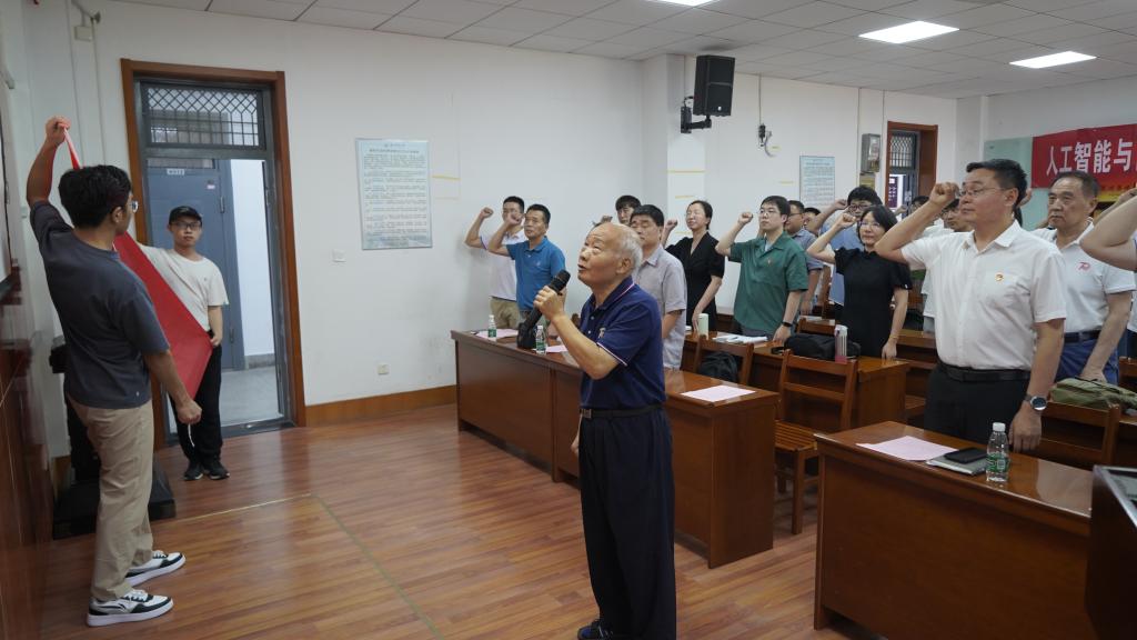 学院退休老党员秦忆作为“光荣在党50年”纪念章获得者代表,带领全体党员重温入党誓词。党员们庄严肃立,高举起右拳,在铿锵豪迈的誓词中牢记入党初心、坚定理想信念。