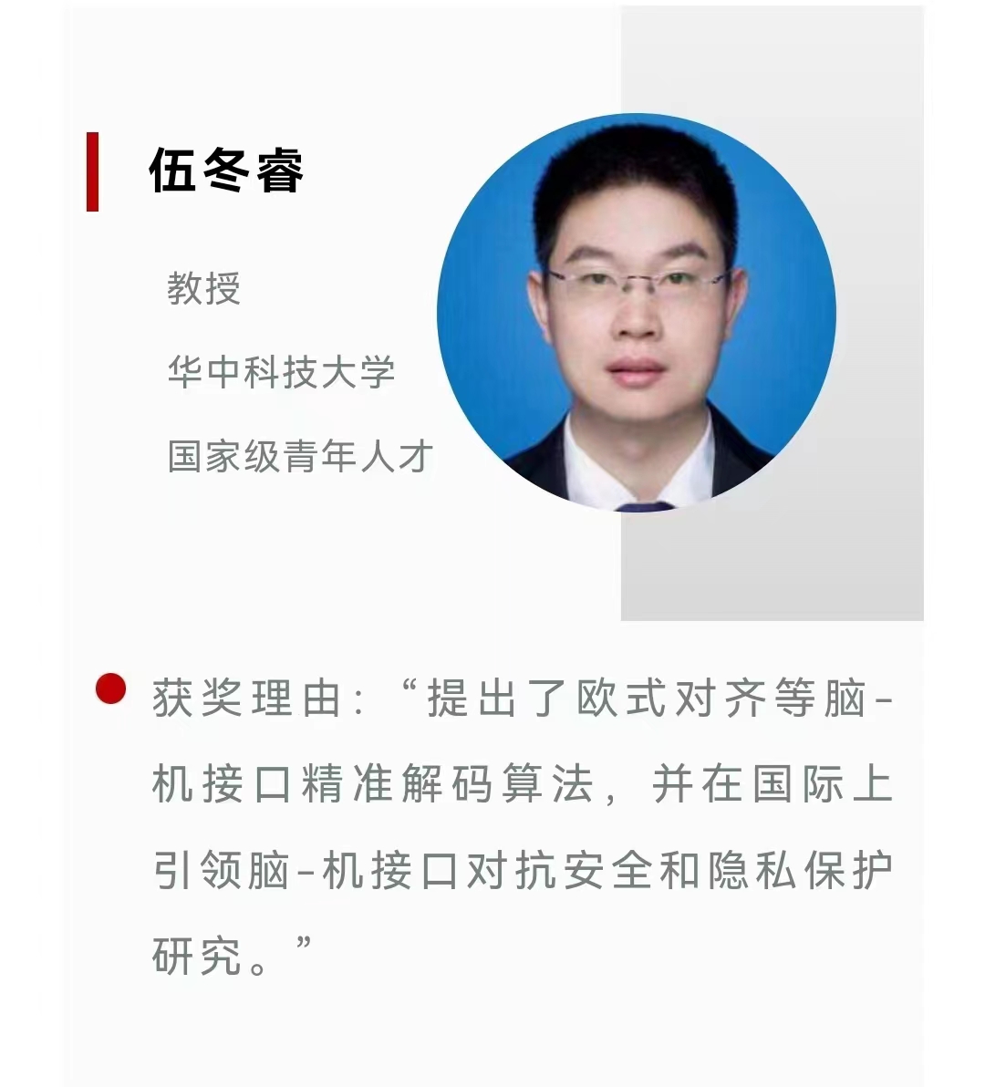 2023年6月,首届中国脑-机接口“华瑙学者奖”正式启动评选,beat365唯一官网教授、博士生导师、国家级青年人才伍冬睿教授荣获杰出青年奖。伍冬睿教授提出了欧式对齐等脑-机接口精准解码算法,并在国际上引领脑-机接口对抗安全和隐私保护研究。