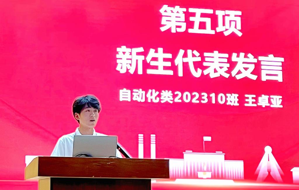 自动化类202310班本科生王卓亚作为新生代表发言,讲述了自己和“人工智能”结缘的历程。他表示,将继续传承“积极进取、锐意创新、包容并蓄、开放交流”的“AUTO”文化精神,将个人理想追求融入新时代的伟大复兴之中,以天下为己任,在仰望星空中融入大我成就小我;以真理为依归,在面向未来中探求未知开启真知;以求是为底色,在脚踏实地中将心动变为行动。