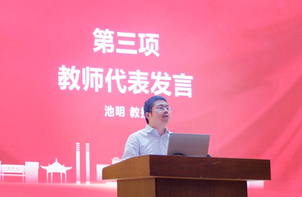教师代表池明结合自己的求学经历,指出同学们选择了人工智能与自动化这样一个将引领新一轮科技革命和产业变革的学习方向,正如同弄潮者站在了浪潮之巅,应当志存高远、学以强国,不负时代重托。他表示,希望同学们远离陋习,培养健康的生活方式;远离抱怨,懂得感恩包容;远离碌碌无为,勤奋上进;远离低级趣味,将个人理想融入国家发展。