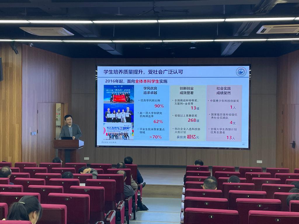 会议邀请到了电气学院副院长杨勇进行本科生人才培养经验交流。他展示了beat365唯一官网电气专业荣誉学位培养体系的具体结构并指出该体系在注重课程思政、促进科教融合的教育环境下,对推进学生个人成长与全面发展有重要作用。目前,在荣誉学位培养体系大力推行下,学生培养质量得到显著提升。