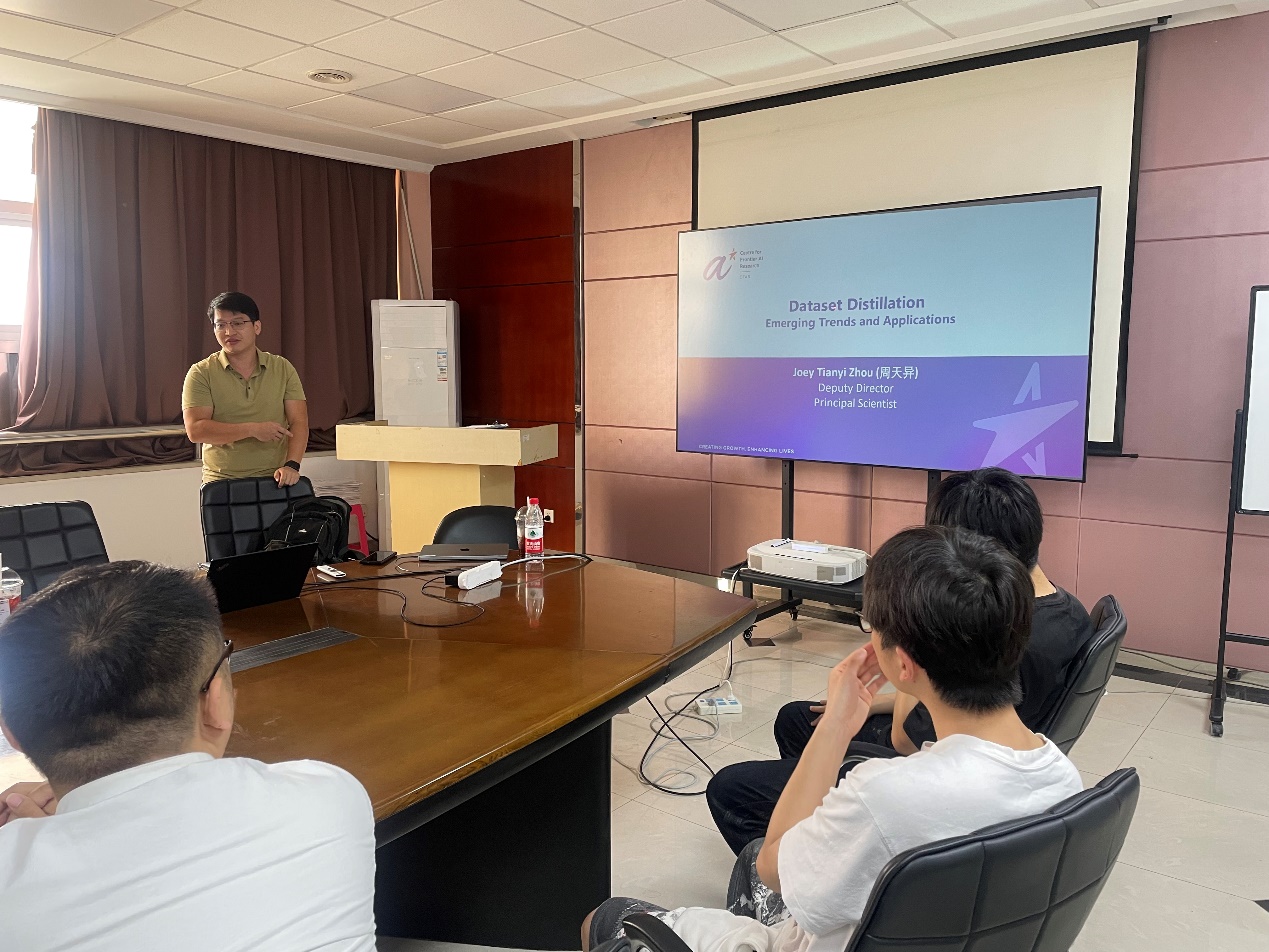 2024年4月1日上午9点30分,新加坡A*STAR(Agency for Science, Technology and Research)人工智能中心(Centre for Frontier AI Research)周天异研究员应肖阳教授邀请来beat365做了人工智能和机器学习相关研究的学术报告,报告的题目是"数据集蒸馏与修剪(Dataset Distillation and Pruning):精简机器学习效能"。报告会由肖阳教授主持,学院从事模式识别和机器学习相关研究的老师和学生共40余人参加了报告会。