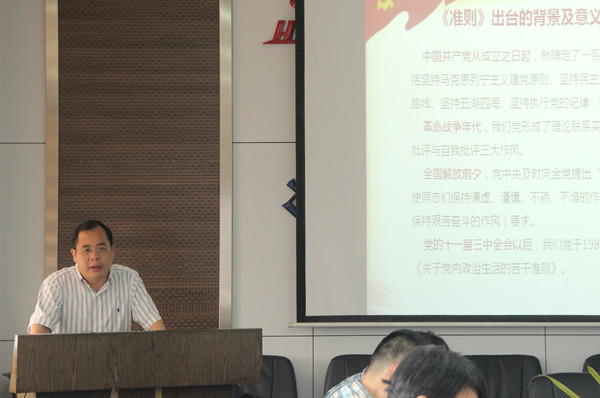 张耀同志就《关于新形势下党内政治生活的若干准则》、《中国共产党党内监督条例》的主要内容进行导读,同时以问题为导向,结合学院实际情况,剖析了学院党委在理论学习上的不足以及贯彻落实《准则》、《条例》方面存在的差距,并针对如何加强师生的理论学习、进一步增强“四个意识”、规范党内政治生活、聚焦学院发展中心工作等方面交流了学习体会,引导与会人员积极思考如何将《准则》和《条例》的精神落实到“两学一做”学习教育的常态化、制度化上去,落实到中央思政工作会议精神上去,落实到学院“双一流”的建设上去。